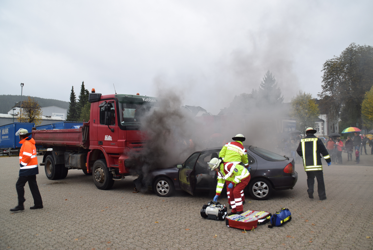 Die Abschlussübung des Löschzuges Attendorn fand am ersten Oktoberwochenende statt. Auf dem Parkplatz der Firma Muhr und Söhne war es zu einem Verkehrsunfall zwischen einem PKW und einem LKW gekommen. Im PKW war eine Person eingeklemmt. Auf der Ladefläche des LKW trat ein Gefahrstoff aus einem Fass aus.