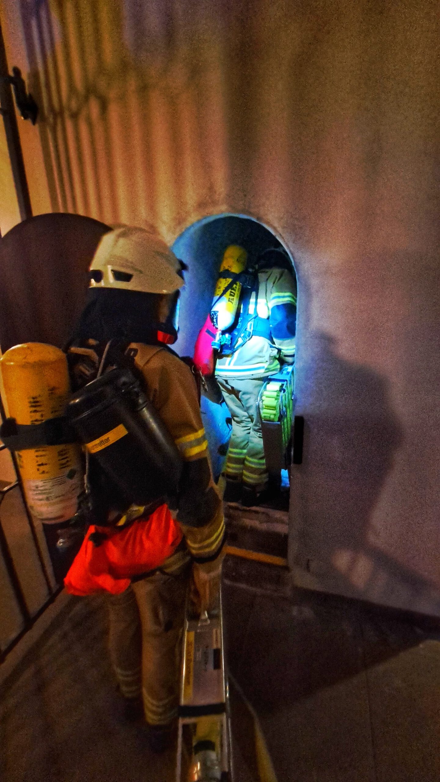 Die räumliche Enge der Wege, die einen Begegnungsverkehr auf- und absteigender Einsatzkräfte unmöglich macht, sorgten für einen erhöhten Koordinationsaufwand im Gebäude. Die teils engen Radien und die schmale Breite der Treppen sorgten beim Transport der geretteten Personen für zusätzliche Herausforderungen.