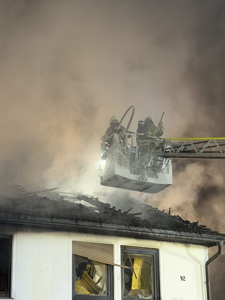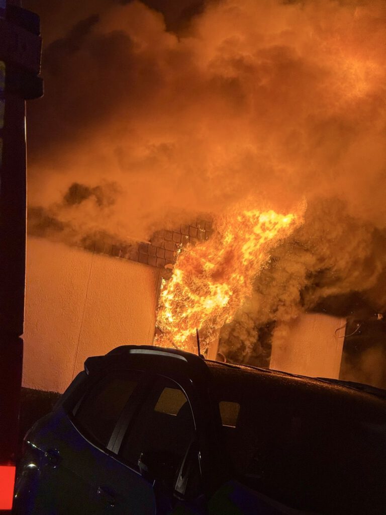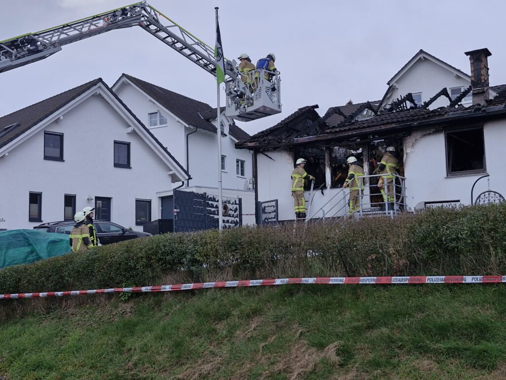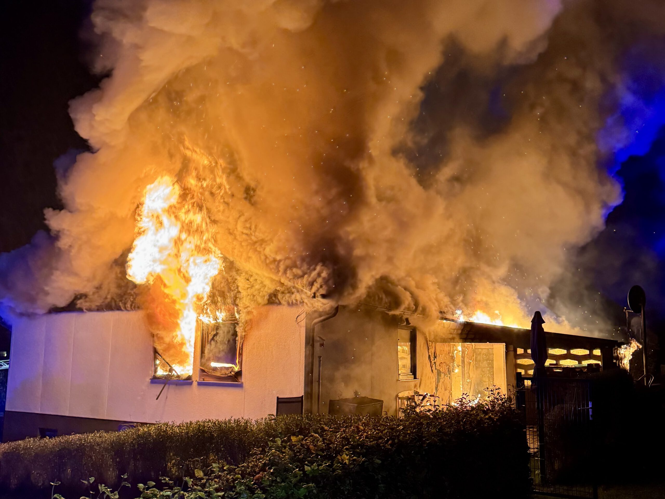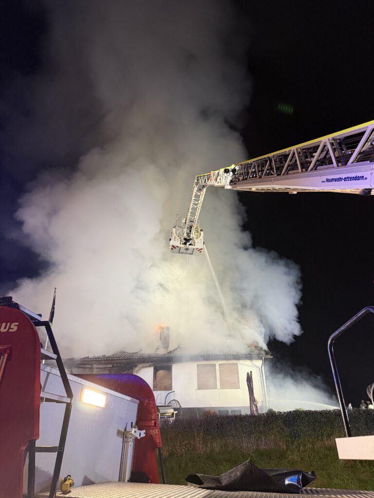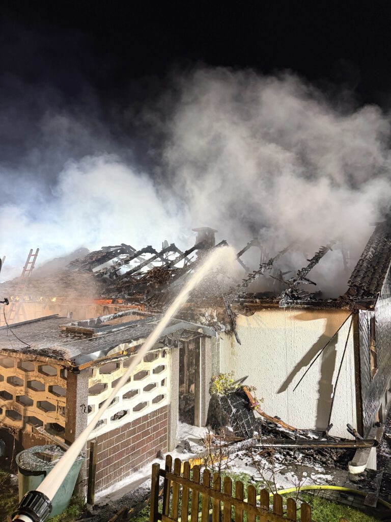 Beim Eintreffen des ersten Löschfahrzeuges um 00:50 Uhr wurde der Vollbrand eines freistehenden Einfamilienhauses festgestellt. Die schlafenden Bewohner waren zuvor durch Rauchmelder geweckt worden und hatten das Gebäude unverletzt verlassen.